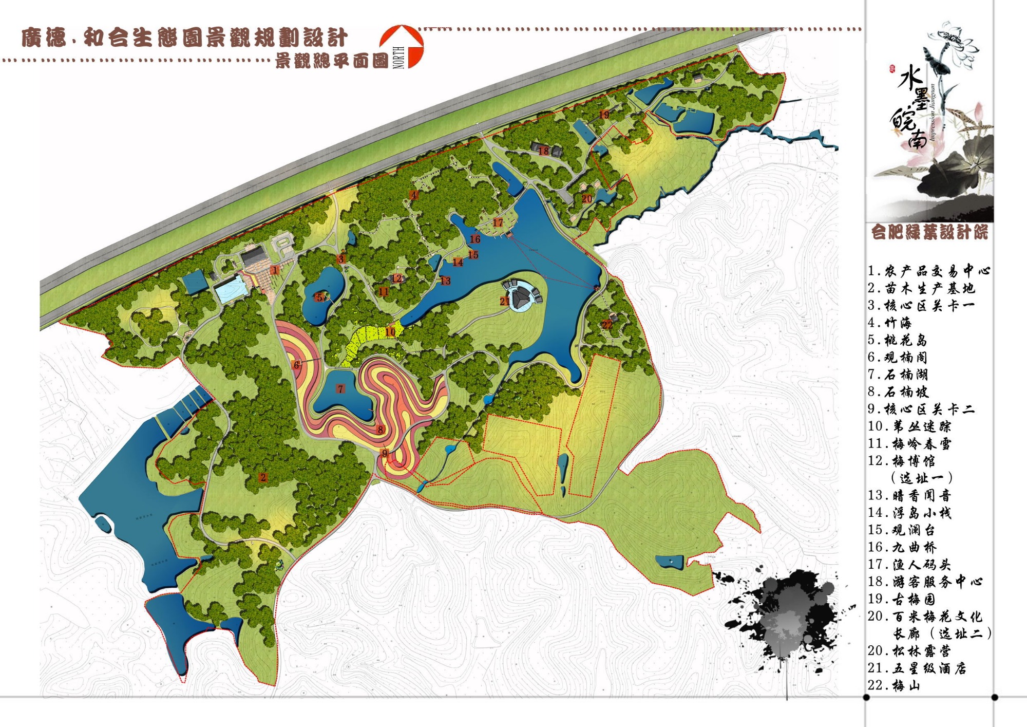 該項(xiàng)目位于合肥市蜀山區(qū)小廟鎮(zhèn)茅鋪村。在規(guī)劃設(shè)計(jì)上堅(jiān)持生態(tài)性、參與性、特色性、文化性、經(jīng)濟(jì)性原則。設(shè)計(jì)中根據(jù)四季的交替變換,每種農(nóng)作物和樹(shù)種的不同顏色和形態(tài),利用作物變化的形態(tài)和自身特有的色彩來(lái)活躍整個(gè)環(huán)境。將農(nóng)業(yè)展示與景觀相結(jié)合,在展示區(qū)內(nèi)設(shè)計(jì)科普廊架、農(nóng)具雕塑及各種農(nóng)業(yè)相關(guān)的小品,使得景觀形態(tài)更具有趣味性。規(guī)劃中通過(guò)構(gòu)建林農(nóng)漁休閑觀光一體化立體交叉新型鄉(xiāng)村生態(tài)旅游,從而打造鄉(xiāng)村田園生產(chǎn)新模式,建