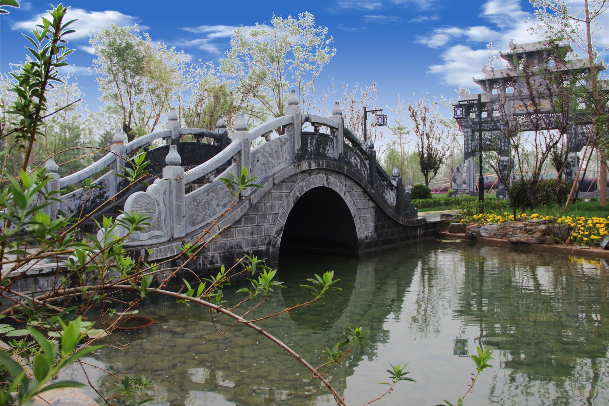 北京園博園合肥園定名為“皖韻·合肥”,施工面積約2800平方米,其中綠化約1610平方米,園建約700平方米,水面約380平方米,位于傳統(tǒng)展園區(qū)內(nèi),展園主體與紅葉石楠、龍柏、紅葉李等安徽特有的觀賞樹種團(tuán)團(tuán)相擁;與園博會(huì)主展館遙遙相望。合肥園以徽派建筑的特色手法,通過(guò)“包公”這一載體,展示了廉政無(wú)私的氣節(jié)。佇立門前的是一方高達(dá)8.58米的青石牌坊,為徽州“古建三絕”之一,寓意國(guó)泰民安、高風(fēng)亮節(jié)。黃石